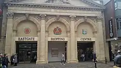 St. Michael's Church was closed early in the Second World War and, due to a declining congregation, all but the tower demolished to make way for shops in 1956.[6] Between 1966 and 1974 the construction of the Eastgate Shopping Centre resulted in the demolition of a large part of the historic Eastgate Street area. The development replaced the 19th century market, converted historic Bell Lane into a car park ramp and transformed Queen Street into the covered passage of today's Queen's Way. The construction of Boots on the site of the Co-op in 1980 gave the city a view of the archaeological remains of the medieval east gate bastion in the Eastgate Viewing Chamber but destroyed the archaeological remains of the Roman wall below on the rest of the site.