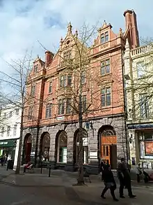 Gloucester became an important regional banking centre in the 19th century. Two banks were built in Eastgate street: the National Provincial Bank in 1889, built on the site of the Crawley-Boevey house, and Lloyds Bank in 1898. On the other side of the National Provincial building, the Guildhall was built 1892 on the site of Sir Thomas Rich's School, which had moved to the former Crypt school in Barton Street three years before.[5]