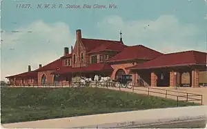 The Eau Claire station, otherwise known as the Chicago, St. Paul, Minneapolis & Omaha Railroad Depot was a historic railroad station located at 324 Putnam Street in Eau Claire, Wisconsin. The station was built in 1893 for the Chicago, St. Paul, Minneapolis & Omaha Railroad, a subsidiary of the Chicago and North Western Railway. The depot was designed by Charles Sumner Frost in the Richardsonian Romanesque style utilizing Lake Superior brownstone. Passenger service on the line was ceased in 1963.