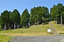 The Ebisuyama Kofun is a zenpō-kōen-fun (前方後円墳), which is shaped like a keyhole, having one square end and one circular end, when viewed from above. It is located in the Noda River basin in the Tango Peninsula, and is orientated to the northwest. The tumulus has an overall length of 170 meters, and is the largest of a group of eight tumuli in this vicinity. It is estimated to have been constructed in the middle of the Kofun period, or the early 4th century. The tumulus was constructed in three tiers, and had both fukiishi, and cylindrical and figurative haniwa. After damage due to the 1927 North Tango earthquake, the tumulus was excavated and three burial facilities have been found in the center of the posterior circular portion, of which one contained a boat-shaped sarcophagus with elaborate carvings. Grave goods included bronze mirrors and iron swords and spearheads. The sarcophagus was designated a Kyoto Prefecture Tangible Cultural Property in 2019.[2] Currently, the site, together with the Tsukuriyama Kofun, is open to the public as the Yosano Municipal Kofun Park.[2]