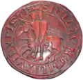The Catholic Church likewise identified the authenticity and ownership of documents and buildings with seals, which were ordinarily enclosed in a pointed ovular shape denominated a "vesica piscis", or simply "vesica", to distinguish them from the circular seals of secular use.[2] King Edward I of England decreed in 1307 that all legal documents required a seal.[3] These seals originally depicted a person, but as secular seals began to depict only shields, clergy likewise used seals with heraldic insignia.[4] Personal seals of bishops and abbots continued to be used posthumously, and gradually became the impersonal seals of dioceses.[3] Clergy tended to replace martial devices with clerical devices. The shield was retained, but helmets and coronets were replaced by ecclesiastical hats; in some religious arms a skull replaced the helmet.[5]