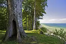 The shores of the bay are shaped by the tides and the surf as during high winds from the northeast and southwest, heavy sea might build up. When the water level is 0.75 m (2.5 ft) higher than usual, sand and gravel is being eroded from the cliff coast. In some places, the coastline recedes 15 to 20 cm (5.9 to 7.9 in) every year. As a result the hills of the Terminal moraines, that had formed during the last Ice Age in the southeast are hollowed out and a 30 m (98 ft) high and 3.6 km (2.2 mi) long cliff has formed in front of Altenhof. The steadily eroded material is partly deposited further west and has separated the Goossee from the Eckernförde Bay. Several sand banks run parallel to the beach. The banks are mainly forested with deciduous trees.[2][3]