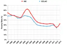 One of the primary ways that the Chávez administration attempted to fix the problem of economic inequality was by wealth redistribution, primarily via land reform, and social programs.[21] The Chávez government pursued a series of Bolivarian Missions aimed at providing public services (such as food, healthcare, and education) to improve economic, cultural, and social conditions. According to the United Nations Economic Commission for Latin America and the Caribbean (ECLAC), poverty rates fell from 49.4% in 1999 to 23.9% in 2012.[27][28][29][30] Data from the National Institute of Statistics (INE) shows that Venezuela's poverty rate decreased between 1999 and 2013 from 48.7% to 32.1%.[31] A 2010 OAS report criticizing Venezuela's human rights standards indicated achievements in addressing illiteracy, healthcare and poverty, and economic and social advances.[32]