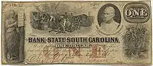 In 1712, the first bank in South Carolina was chartered in Charleston. It stayed in commission until it was destroyed during the Revolutionary War.[81] Almost two decades would follow until the newly formed state government of South Carolina chartered the Bank of South Carolina in 1792. Then in 1812, the legislature chartered an additional bank with a similar name called the Bank of the State of South Carolina (BSSC) which was the state's financial arm. The BSSC received all taxes, negotiated any necessary loans for the state, and paid the state's expenses. Any profits were used to pay off public debt. By 1820 there were five banks in Charleston which all had capital close to $1 million.[82]