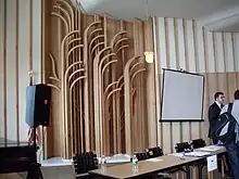 Aalto, working with his wife Elissa,[4][14] designed various pieces of furniture within the conference center.[1] These include birch chairs upholstered with black leather, as well as a movable bar.[4][6] The birch chairs were meant to complement the color scheme of the walls in the lobby and the reception hall. In addition, the conference center contains side chairs with reflective quilting on their backs.[17] Elissa Aalto designed brown rugs for the space as well.[4] Most of the design elements were made in Finland.[4][18] Many spare pieces of decoration were stored in the IIE building's basement.[19]