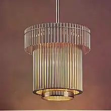 There are vase-shaped shades, gold-plated chandeliers, upright lamps, and molded door handles made of bronze.[4] The lighting fixtures contained gold-plated copper and leather, creating a sparkling effect.[12][15] Each chandelier contains clusters of small rods arranged in concentric circles. The light passes through a metal filter at the bottom of each chandelier; according to Aalto, it took half a year to design this feature. The chandeliers near the reception hall's eastern wall are designed with white reflectors to admit more natural light.[12] The lighting fixtures were created by 70 men who worked in Aalto's factory.[7]