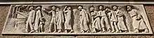 On returning to Budapest, Kiss illustrated her concentration camp experiences in a series of 30 gouache sketches titled Deportation which she exhibited in the city on 22 September 1945. After divorcing her first husband, she married Sándor Kiss and emigrated to the West with him. Shortly after their departure, in July 1948 the four large stone reliefs of the deportation she had created were set in the outer wall of Budapest's Újpest Synagogue.[3] One relief shows a Hungarian policeman directing Jews to cattle trucks for deportation, a second shows an Arrow Cross Party guard overseeing men in a labour battalion, a third presents a Nazi guard herding Jews into the gas chambers and the fourth shows Red Army soldiers being welcomed by Jews in Budapest.[4]