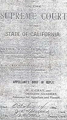 In 1862, Visalia was a community deeply divided by the American Civil War (1861–1865) and many sided with the South. Despite the turmoil, Wysinger stayed in the community. Wysinger, a self-educated man, worked as a laborer and part-time preacher. He stressed the importance of education for his children. He tried to admit his son Arthur to a regular public school but was refused, resulting in him entering a suit against the county school board of education in the Supreme Court of the State California in October 1888. On March 1, 1890, the California Supreme Court, in Wysinger vs. Crookshank reversed a lower court decision and ordered that 12-year-old Arthur Wysinger be admitted to Visalia's regular school system.[2]