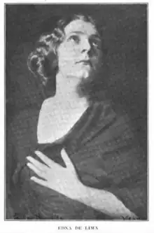 Edna de Lima first sang at New York's Aeolian Hall in 1916.[9] She made her Chicago concert debut in 1917, when a reviewer declared that "Nature has been bounteous to Mme. de Lima in the bestowal of personal attractiveness and grace of manner in addition to the crystalline purity of her voice."[10] She was billed as "formerly of the Vienna Opera" when she appeared at the Stadium Concerts in New York in the summer of 1918.[11] She performed on a bill with pianist Winifred Byrd, tenor Dan Beddoe, and violinist Michel Gusikoff, for the Globe Music Club later in 1918.[12] She translated lyrics for recitalists, including Margaret Matzenauer. During World War I, she sang at concerts for the Liberty Bond Campaign,[13] and for the Red Cross.[14]