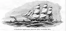 Through the 1850s, Jachmann held a variety of roles. He served as the executive officer aboard the frigate SMS Gefion, again as the commander of Amazone, and as the shipyard director at the Königliche Werft (Royal Shipyard) in Danzig.[5] During this period, Jachmann commanded a flotilla of ten gunboats during exercises in July and August 1851.[6] In 1855, Jachmann was promoted to the rank of Korvettenkapitän (Corvette Captain).[7] On 3 December 1856, he was appointed as the Director of the Technical Department of the Admiralty.[5] Jachmann was promoted again in 1859, to the rank of Kapitän zur See (KzS—Captain at Sea). By this time, Jachmann was the third highest-ranking officer in the Prussian Navy, behind only Prince Adalbert of Prussia and the Swedish captain Henrik Sundewall.[7]