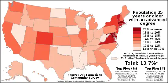 - ↑ Note that these add up to more than 100% because they are cumulative; e.g. it is assumed that all people with doctorates also have undergraduate and high school degrees, and are thus counted twice in the "lower" categories. Age 25 is used rather than age 18 because there are few people aged 18 or over with advanced degrees. "Educational Attainment in the United States: 2018". U.S. Census Bureau. Retrieved June 23, 2018. Percentages are calculated based on census data by counting people that had attained that level or higher.