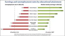 Educational attainment is one of the primary indicators of social class in the United States.[31] While the American social class system is a vaguely defined concept with many contradicting theories,[32][33] educational attainment emerges as one of the top assessments of social class. Not only is a high educational attainment a status symbol by itself, but it is also very closely related to the other two main indicators of social class: occupation and income. A graduate degree and the roughly seven to eight years of post-secondary education serve as the main requirement for entering the "professions" and becoming part of the professional middle class.[31]