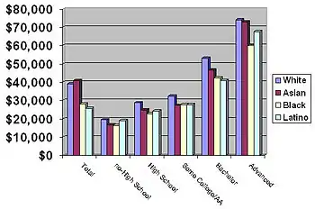 Overall, European Americans with an advanced degree had the highest average annual income with $74,122. Asian Americans had the second highest with $72,852. Hispanics and African Americans had the lowest annual incomes among those with advanced degrees averaging $67,679 and $59,944 annually. The largest racial inequity was between European Americans with a bachelor's degree who made $53,185 and Hispanics who made $12,263 or 29.9% less with an average annual income of $40,949.[3] However, Asian Americans as a whole earn more than any other race due to a greater percentage of them being educated overall, an example of Simpson's paradox.