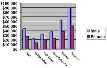 Educational attainment is strongly correlated with income in the United States. Although the incomes of both men and women are associated with higher educational attainment (higher incomes for higher educational attainment), large income gaps linked to race and gender remained at each educational level. In 2003, average incomes ranged from $13,459 for a male high-school dropout to $90,761 for a male with an advanced degree. The most significant average income difference was between those who had some college education or an associate degree and those who had a bachelor's degree. While those with some college averaged $31,046, those with a bachelor's degree averaged $51,194, over $20,000 (64.9%) a year more.[3]