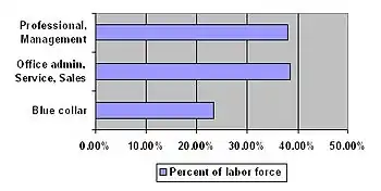 Overall, the least educated occupational field was agriculture, ranking last on all educational levels. Here 55.4% had graduated from high school, roughly one fifth (20.8%) had some college education or an associate degree and 6.8% had a bachelor's degree or higher. While the largest occupational field, that consisting of professionals and relating occupations was also the largest field, the fields with lower educational attainment combined were larger than the professional and managerial fields combined. Overall, 38.02% were employed in the professional and managerial fields while 61.89% were employed in the other white and blue collar fields were those with a bachelor's degree or higher constituted less than a third of the work force.[3]