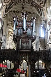 On 8 August 1609 Gibbons became a vicar—a parish priest, as opposed to a rector[25]—for Exeter.[26] Because he was a layman, a special dispensation was required (submitted on 25 March 1609),[27] which described him as "unmatched skill and skill in music and singing".[28][n 10] Gibbons may have received said position because of his association with Cotton, who was known for patronage toward his family and colleagues.[27] By 1614 Gibbons had become head (custos) of the college of priest-vicars and succentor by 1615,[2] the latter position being due to a mandate by Archbishop George Abbot.[29] As succentor, Gibbons may have been responsible for playing organ during services.[18] Two other priests filed a joint-complaint in 1617, accusing Gibbons of neglecting his duties.[30] Gibbons "relinquished" his position as succentor on 15 December 1627, but the complaint was repeated in 1634.[30] Though it was not unprecedented for a layman to be a vicar priest, the complaints may have stemmed from the other priests's dissatisfaction of his humble origins.[18] Regardless, records indicate—up to 24 May 1640—that Gibbons continued an association with the choir.[30]
