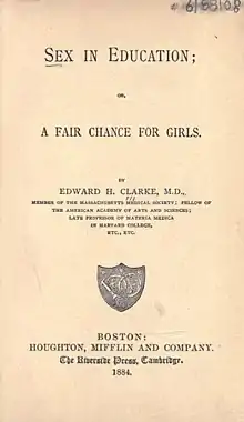 Clarke first revealed his views on education for women when he was invited to speak at the New England Women's Club of Boston in 1872.[3] Although he claimed that women should be allowed to learn whatever they could, he doubted women had the same ability to succeed as men. In fact, he believed that women's educational capacity was limited by their physiology. The members of the Women's Club were shocked by Clarke's contention about the alleged intrinsic inferiority of women's potential for education compared to men.[3]