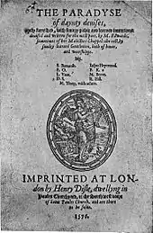 In 1586 Angel Day dedicated The English Secretary, the first epistolary manual for writing model letters in English, to Oxford,[132] and William Webbe praised him as "most excellent among the rest" of our poets in his Discourse of English Poetry.[133] In 1588 Anthony Munday dedicated to Oxford the two parts of his Palmerin d'Oliva.[134] The following year The Arte of English Poesie, attributed to George Puttenham, placed Oxford among a "crew" of courtier poets;[135] Puttenham also considered him among the best comic playwrights of the day.[136] In 1590 Edmund Spenser addressed to Oxford the third of seventeen dedicatory sonnets which preface The Faerie Queene, celebrating his patronage of poets.[137][138] The composer John Farmer, who was in Oxford's service at the time, dedicated The First Set of Divers & Sundry Ways of Two Parts in One to him in 1591, noting in the dedication his patron's love of music.[139]