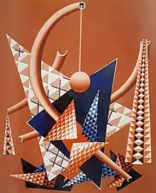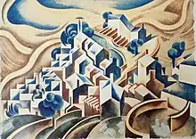 Wadsworth exhibited some futurist-derived paintings at the Futurist Exhibitions at the Doré Gallery. Although a member of the committee that organised a dinner in honour of Filippo Tommaso Marinetti in 1913, he was one of a number of British painters in the nascent avant-garde that became increasingly disenchanted with the Italian's arrogance and jeered Marinetti's public performance of The Battle Of Adrianople.[14] Wadsworth exhibited woodcuts at the Twenty-One Gallery, London in the Spring of 1914 and in that year he also exhibited with the London Group, the Allied Artists' Salon and in the 'Twentieth Century Art' exhibition at the Whitechapel Gallery. He was closely associated with Wyndham Lewis and 'joined' his Rebel Art Group and was a signatory of the Vorticist Manifesto published in BLAST where he contributed illustrations and supplied a review of Kandinsky's Concerning The Spiritual In Art.[15] Wadsworth's vorticist work is now known from his bold, experimental woodcuts as all his oil paintings from 1914-1918 are now lost.[16]