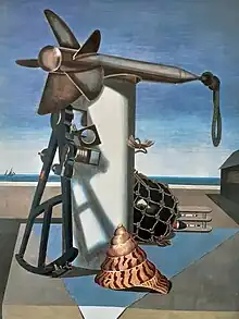 In the second half of the 1920s Wadsworth concentrated on marine themed still life compositions. Perhaps following ideas articulated by Léger[28] and to some extent exemplified in the work of the German Neue Sachlichkeit painters, Wadsworth juxtaposed modern manufactured objects such as marine navigational equipment with symbols of culture, contrasting the organic - such as sea shells - with the manufactured and using dramatic perspective effects to contrast the small with the vast. His use of tempora created a kind of realism that seemed ultramodern whilst also harking back to the past.