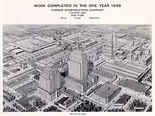He prepared the Turner City drawings for 1929 to 1962 in succession to Edward W. Spofford.[4] It was a condition of the work that at least two sides of each building be shown and, ideally, with the entrance visible.[7] Mott continued the aerial perspective method used by Richard W. Rummell, the first artist to prepare Turner City, receiving the blueprints months in advance and first making cardboard models of each building on a table to get the scale right. Then, in his studio in a converted garage, with the windows blacked-out, he would photograph the model from a step ladder and draw it in pencil, finishing with an ink wash. The street layout was from Mott's imagination but always different and he included a trademark train in each drawing. Each building was numbered and a key on the reverse gave their real location, apart from during the Second World War when that information was secret.[4]