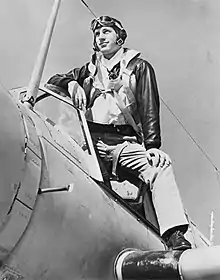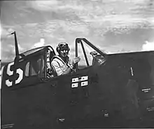 Flying the Grumman F6F Hellcat, he shot down four Japanese aircraft during the squadron's combat tour, and hit a Japanese aircraft carrier with a bomb during the Battle of Leyte Gulf.[3]