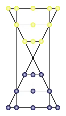 The board consist of two triangles connected together at a common vertex. Players play on opposite sides of the board with the base of each triangle forming the first rank of each player. Two lines cross the breadth of each triangle forming the second and third ranks respectively of each player. The common vertex is the fourth rank of each player, and is also the central point of the board. A single line perpendicular to the base of each triangle runs through the common vertex. Two more lines connect the two triangles where the second ranks intersect with their respective triangles and extend all the way to each triangle's base. There are a total of 23 intersection points. Pieces are situated on the intersection points, and move along the lines.