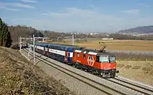 The Eglisau–Neuhausen railway line is a cross-border railway line in Germany and Switzerland. It links Eglisau in the Swiss canton of Zurich with the city of Schaffhausen in the Swiss canton of Schaffhausen, crossing some 8 kilometres (5.0 mi) of the German state of Baden-Württemberg in between. It thus crosses the Germany–Switzerland border twice. The line is 17.88 kilometres (11.11 mi) long, standard gauge and electrified at 15 kV  16.7 Hz AC supplied by overhead line. It is formed of a mixture of single and double track sections.[1]