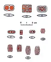 In addition, Egyptian objects were created which clearly mimic Mesopotamian forms, although not slavishly.[21] Cylinder seals appear in Egypt, as well as recessed paneling architecture, the Egyptian reliefs on cosmetic palettes are clearly made in the same style as the earlier and contemporary Mesopotamian Uruk culture, and the ceremonial mace heads which turn up from the late Gerzean and early Semainean are crafted in the Mesopotamian "pear-shaped" style, instead of the Egyptian native style.[22] The first man/animal composite creatures in Egypt were directly copied from earlier Mesopotamian designs.[23] It is also considered as certain that the Egyptians adopted from Mesopotamia the practice of marking the sealing of jars with engraved cylinder seals for informational purposes.[24]