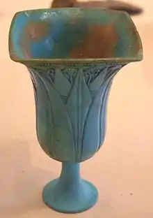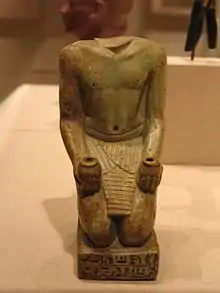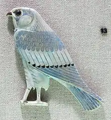 Ptolemaic and Roman faience tends to be typologically and technologically distinct from the earlier material: it is characterized by the widespread use of moulding and high relief on vessels.[22] A very unusual and finely made group of figures of deities and falcons in the Metropolitan Museum of Art in New York, apparently representing hieroglyphs that are elements from a royal inscription, perhaps from a wooden shrine, is decorated in a form of champlevé (typically a technique for enamel on metal). Depressions in the faience body were filled with coloured "vitreous pastes" and refired, followed by polishing.[23]