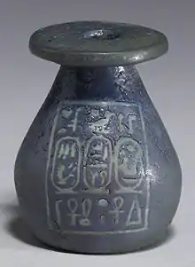 Egyptian faience is a sintered-quartz ceramic material from Ancient Egypt. The sintering process "covered [the material] with a true vitreous coating" as the quartz underwent vitrification, creating a bright lustre of various colours "usually in a transparent blue or green isotropic glass". Its name in the Ancient Egyptian language was tjehenet,[1] and modern archeological terms for it include sintered quartz, glazed frit, and glazed composition.[2] Tjehenet is distinct from the crystalline pigment Egyptian blue,[3] for which it has sometimes incorrectly been used as a synonym.[2]