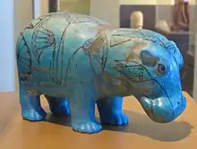 Egyptian faience was very widely used for small objects, from beads to small statues, and is found in both elite and popular contexts. It was the most common material for scarabs and other forms of amulet and ushabti figures, and it was used in most forms of ancient Egyptian jewellery, as the glaze made it smooth against the skin. Larger applications included dishware, such as cups and bowls, and wall tiles, which were mostly used for temples.[4] The well-known blue hippopotamus figurines, placed in the tombs of officials, can be up to 20 cm (7.9 in) long,[5] approaching the maximum practical size for Egyptian faience, though the Victoria and Albert Museum in London has a 215.9-centimetre (85.0 in) sceptre, dated 1427–1400 BC.[6]