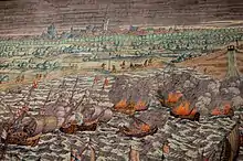 Count Willem IV van den Bergh, William of Orange's brother-in-law, captured the city of Zutphen, followed by other cities in Gelderland and neighbouring Overijssel.[27] In Friesland rebels had seized several cities.[27] The royalist stadtholder Caspar de Robles sacked Dokkum in reprisal, killing many citizens (Walloon Fury in Dokkum).[27] Louis of Nassau captured Mons by surprise on 24 May, but on 21 June Alba started besieging the city. William marched to Mons to support him, but a Spanish night raid on his camp forced Orange to withdraw through Mechelen, where he left a garrison. A French Huguenot army seeking to relieve Louis at Mons was also defeated in the Battle of Saint-Ghislain (17 July 1572) by Spanish forces under Philip of Noircarmes and Don Fadrique. Moreover, in the night of 23–24 August 1572, the St. Bartholomew's Day massacre was committed against the Huguenot leaders in Paris, crushing any remaining hopes of Calvinist reinforcements from the south.[2] Louis surrendered Mons on 19 September on the condition of an honourable withdrawal. On the other hand, Alba had troops sack Mechelen on 2 October, after which towns in the southern Netherlands hastened to pledge renewed loyalty to Alba.[28][29]