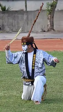 Another important factor related to the origin of Eisa is Chondaraa (チョンダラー), a group of puppeteers. The Ryūkyū-koku yuraiki records two theories regarding the etymology of Chondaraa. One is that it indicates their origin, Kyoto. The other is that its founder was named Kyō (no) Kotarō (京小太郎). The fact that their origin had been obscured by the early 18th century suggests that they came from mainland Japan a long time ago. Based on modern-day Shuri Kubagawa-chō (part of the capital Shuri), they performed puppet plays, chanted Banzei (manzai) on celebratory occasions and sang nembutsu songs as a funeral service. For these reasons, they were also called Ninbuchaa (nembutsu prayer) or Yanzayaa (banzei chanter). It is uncertain if the Chondaraa performed nembutsu from the very beginning or learned later from a different group.[4] Unlike Taichū's followers, they wandered around Okinawa Island.[3]