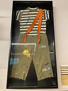 El Chavo is freckled and wears a green checkered cap with visor and earmuffs, a patched white T-shirt with brown and yellow horizontal stripes, brown pants held up by two red suspenders over his left shoulder, and black shoes, a gift from La Chilindrina. with yellow laces.[4]