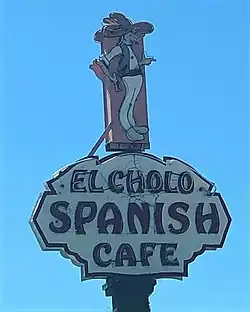 In 1923, Alejandro and Rosa Borquez opened the Sonora Cafe at Santa Barbara Avenue and Moneta Avenue in Exposition Park, near where the Coliseum now stands.[3] In 1925, a guest came into the restaurant and drew a caricature that he called a 'El cholo' – at that time referring to "field hands" of the Spanish settlers.[4] Alejandro liked the image and changed that name of the restaurant to "El Cholo" with the drawing becoming its mascot.[4] Alejandro and Rosa's daughter Aurelia, and her husband George Salisbury, later opened a second location at 1107 Western Avenue at the western edge of the city (now Koreatown). In 1931, the restaurant moved across the street to its current location.[3]