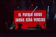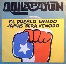 "¡El pueblo unido jamás será vencido!" (Latin American Spanish: [el ˈpweβlo wˈniðo xaˈma(s)seˈɾa βenˈsiðo]; English: "The people united will never be defeated") is a Chilean protest song, whose music was composed by Sergio Ortega Alvarado and the text written in conjunction with the Quilapayún band.[1] Together with the song "Venceremos", also by Ortega, it is one of the most successful songs of the Nueva canción chilena (New Chilean Song) movement.[2] The theme has a marching rhythm, highlighting its chorus, which is a shout or slogan with only percussion.[2] The song has been used in various protests around the world against either left or right-wing dictatorships, most of which have no direct connection to the Chilean coup or Latin America. The lyrics have been adapted or translated into many languages.