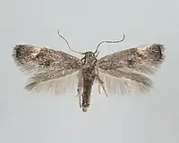 The wingspan is 7–8 millimetres (0.28–0.31 in).[1] The head is grey, face whitish. Forewings in male grey, in female blackish-grey ; plical stigma black, elongate, followed by a white dot ; an oblique white triangular costal spot at 2/3 ; a small indistinct whitish tornal spot somewhat beyond it. Hindwings grey.grey.[2]