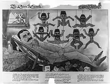 Political cartoon published in the Cairo Punch, showing Sir Eldon Gorst, reclining and holding strings attached to puppets representing Egyptian ministers