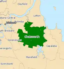 Chatsworth is an electoral district of the Legislative Assembly in the Australian state of Queensland. The electorate is centred on the south-eastern suburbs of Brisbane and stretches north to Tingalpa, west to Carina Heights, east to Tingalpa Creek and south to Bulimba Creek.[1]