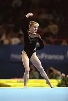 Elena Mikhailovna Zamolodchikova (Russian: Елена Михайловна Замолодчикова; born 19 September 1982)[3] is a Russian former artistic gymnast and four-time Olympic medallist. She is the 2000 Olympic champion on vault and floor exercise, and she is a two-time World champion on vault (1999, 2002). In 2015, she was inducted in the International Gymnastics Hall of Fame.[2]