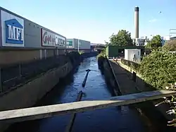 Salmons Brook flowing through the estate before passing under the North Circular Road at Angel Road. The Edmonton Incinerator chimney can be seen in the background