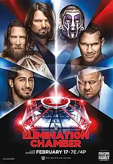 At the Royal Rumble, Daniel Bryan defeated AJ Styles to retain the WWE Championship with help from the returning Rowan.[20] On the following episode of SmackDown, Bryan, along with Rowan, disposed the standard leather-bound title belt with metal plates in a garbage can and introduced a new custom belt made from hemp and wood. Styles then confronted Bryan and Rowan, followed by Randy Orton, Samoa Joe, Jeff Hardy, and Mustafa Ali. After an ensuing brawl, WWE Chief Operating Officer Triple H scheduled Bryan to defend the championship against the five in an Elimination Chamber match at the pay-per-view.[15] A gauntlet match between the six was scheduled for the February 12 episode to determine who would enter the chamber last.[21] Due to a legitimate injury, however, Ali was pulled from the match and replaced with The New Day's Kofi Kingston. Orton won the ensuing gauntlet match, making him the last entrant in the chamber.[19]