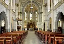 From an architectural point of view, the church is built in the eclectic style with neo-Gothic influences. Among the neo-Gothic elements we can observe: the shape of the gaps – broken arch, the decorative rosette above the entrance, gargoyles, a decorative turret from the east and the branched veins on the inner vault.[8] The church impresses with its symmetry, slenderness, balanced distribution of interior space and giant stained glass windows that achieve good interior lighting in a warm yellow hue. The Gothic altar was brought from the old Roman Catholic church in Mehala, and the five altars that segment the interior were made in Ferdinand Stuflesser's workshop from Urtijëi (South Tyrol).[9] The church is 52 m long and 22 m wide. It has four towers, of which two towers with a height of 57 m.[2]