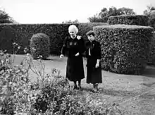 Sister Kenny (left) with her secretary in Kenny's garden in Toowoomba, 1952