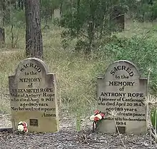 Gravestones of Anthony and Elizabeth Rope in the Castlereagh General Cemetery, Cranebrook. It is an Australian pioneer burial place in a bush setting.