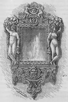 Mirrors, which were very rare in Elizabeth's time, became more common in that of the Charleses, the Duke of Buckingham, during the reign of the second Charles, bringing a colony of Venetian glassmakers to Lambeth. One Elizabethan mirror is some three and a half by four and a half feet in size — five feet was the largest made till the latter part of the eighteenth century — the frame is carved in oak and partially gilt, and the glass is set flatly. In one mirror of the time of Charles II the glass is beveled, and in the glasses of the Merry Monarch's predecessor the frames were so made as to throw the glass forward and give it projection. Quicksilvered glass itself, unset, became a novelty, so that sometimes whole rooms, and even the ceilings, were lined with it. The mirrors made by the duke's colony were of superior excellence; they had an inch-wide bevel all along their outer extremity, whether they were rectangular or curved. "This," says Mr. Pollen, "gives preciousness and prismatic light to the whole glass. It is of great difficulty in execution, the plate being held by the workman over his head, and the edge cut by grinding. The feats of skill in this kind, in the form of interrupted curves and short lines and angles, are rarely accomplished by modern workmen, and the angle of the bevel itself is generally too acute, whereby the prismatic light produced by this portion of the mirror is in violent and too showy contrast to the remainder."