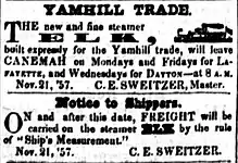 As of November 1, 1859, businessman Theodore Wygant (1831-1905) was the Elk's agent in Portland, Oregon.[8] Wygant was also agent at the same time for the steamers Onward, Surprise, and Relief.[8] Wygant formed these steamers into the Upper Willamette Transportation Line, and starting November 19, 1859, advertised, stage of water permitting, steamers of the line would depart for Corvallis twice a week, and, for Eugene City, once a week.[8] This arrangement was advertised until June 30, 1860.[9]