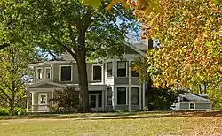 Built of weatherboarded walls on a stone foundation, the house is covered by a slate roof.[2] Two stories tall, the frame Hess House mixes details of the Queen Anne and Colonial Revival styles. The facade features a veranda-style porch with a delicate balustrade and Ionic columns. Underneath the porch roof, the main entrance is surrounded by large sidelights, while a transom window of leaded glass sits above the doorway. The overall floor plan is that of the letter "L", divided into four bays on the front and three on the sides.[3]