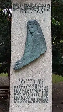 A ceremony at Arne-Karlsson-Park in Vienna on 16 September 1965 preceded the official opening of the XXth International Conference of the Red Cross. In the presence of Austrian civilian and military authorities, members of the Swedish colony, leaders of the Austrian Red Cross and many conference delegates, a monument to Elsa Brändström was unveiled. This monument, by the sculptor Robert Ullmann, stands as a testimony of gratitude to the famous Swedish nurse's work for German-Austrian prisoners during the First World War.[13]